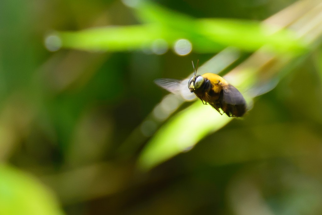 藤の花 写真 2013.04.25 昨日の休みがまた雨でムシャクシャ・・・ 今朝、近所で藤が咲いてました。 藤を撮ろうと近づいたらブンブンと藤の蜜狙いでしょう。クマンバチが飛び交っていまして、動きモノに弱い私は数枚トライしましたが、ジャスピンってのは無理でしたぁ。MFで置きピンしたんですけど、望遠じゃ難しいです。